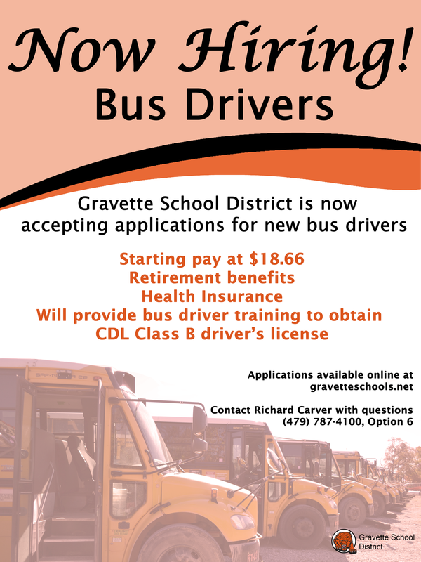 The Gravette School District is now hiring for bus drivers. We are offering competitive pay starting at $18.66 an hour with Arkansas Teacher Retirement benefits and health insurance. We will provide training for any driver to obtain a CDL Class B driver's license. Applications are available here. You can also contact Richard Carver, Transportation/Maintenance Director, with any questions at (479) 787 4100, option 6.