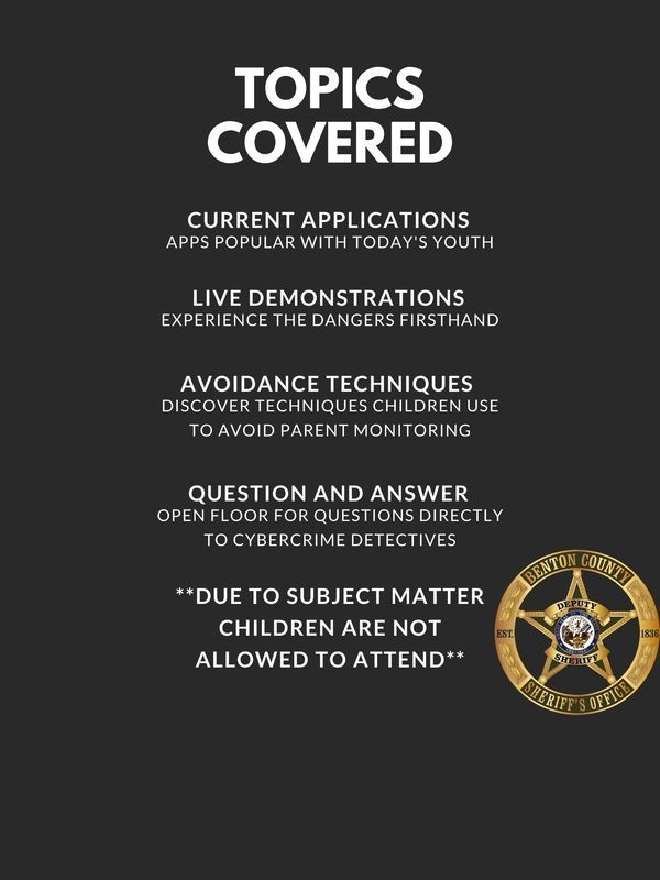 If you ever had questions about cyber crimes and how to protect your children, now is the time to learn! The Benton County Cyber Crimes unit will host an informational Parent's Night Out event on Wednesday, October 6th from 6-8 p.m at Bentonville West Arend Arts Center. Parents will learn about current apps and the dangers that can be on them. There will be live demonstrations to help parents learn about the dangers and experience them firsthand. The Cyber Crimes unit will teach parents how children are avoiding monitoring of applications. You will also get a chance to ask detectives any questions you have. This event is all inclusive and free to parents and guardians. Sign-ups are required. No children are allowed to attend. You can sign-up to attend via this link.