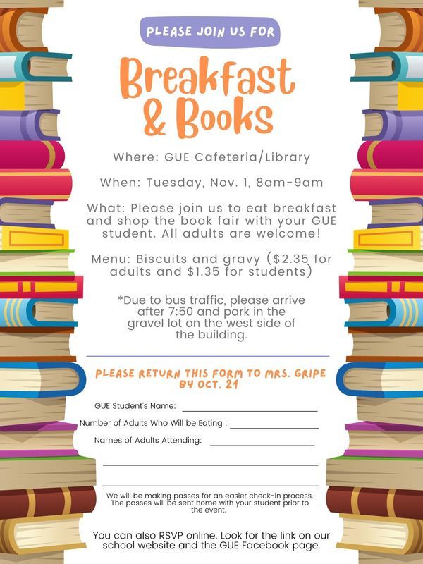 Come join us for Breakfast & Books! This is an opportunity for you to eat delicious biscuits and gravy with your child and then shop around at the book fair. ๐
